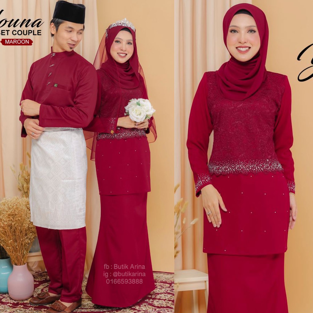 Set Baju Kurung Moden Youna Nikah Sanding Tunang Bridesmaid Couple Sedondon Maroon Merah Hati Koleksi Hari Raya Shopee Malaysia